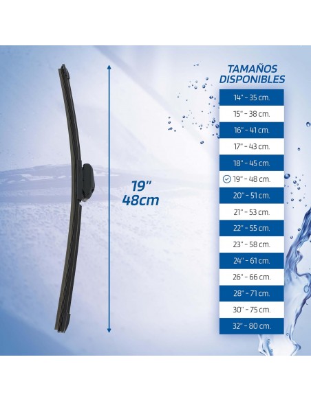 Diseñado específicamente para adaptarse a vehículos con 48cm de longitud de hoja, este limpiaparabrisas garantiza una limpieza eficiente y una visibilidad clara incluso en las peores condiciones climáticas. Comprobar medida del parabrisas para elegir la adecuada para su vehículo.