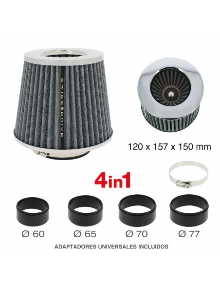 Filtro de Aire Universal para Coche Incluye 4 Adaptadores 60mm 65mm 70mm 77mm Color Gris