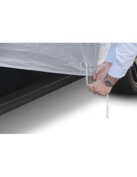 • La funda ya queda perfectamente sujeta con los bajos elásticos de las esquinas, pero dispone de cuerda (ver fotos) por si se quisiera más seguridad para periodos prolongados (un mes o más) sin dar uso al coche. La funda ya es perfectamente funcional sin ella, pero da un plus que costaba muy poco hacer.