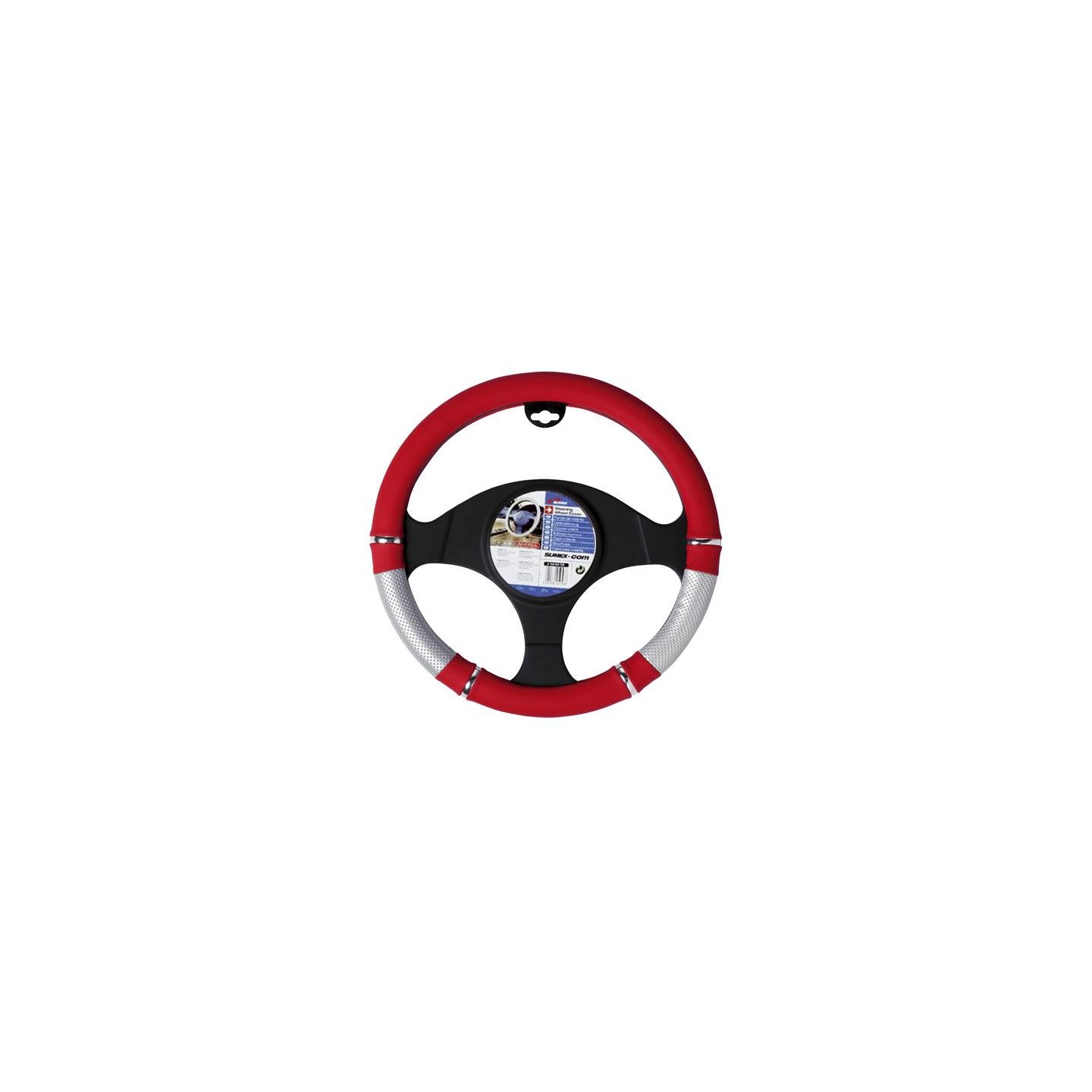 Funda de volante hecha en PVC. Disponible en 3 colores (rojo, azul y negro) con una combinación de plateado y para un diámetro de 37 a 39 cm de volante, por lo que es universal para todo tipo de coches.