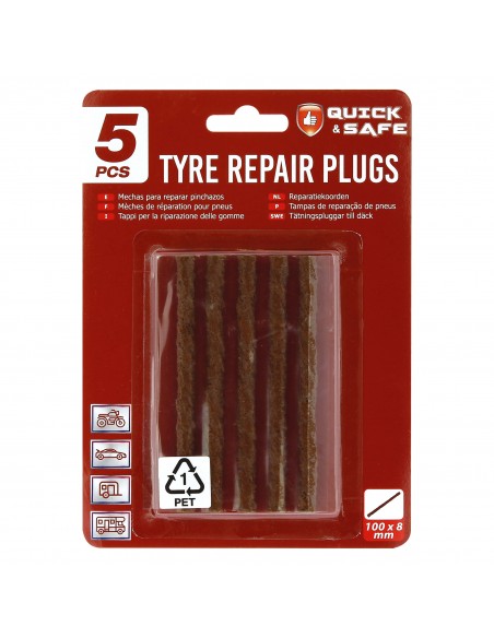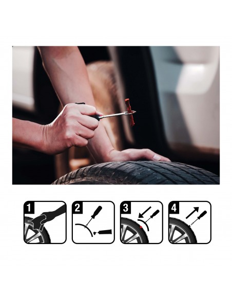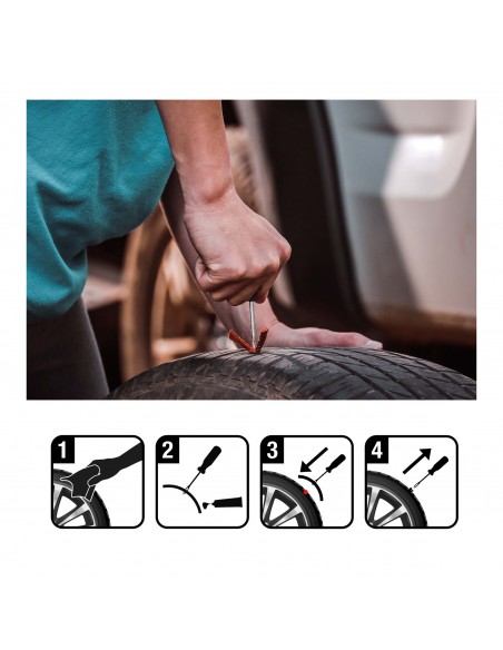 Este kit de reparación de pinchazos es el más útil y sencillo del mercado. Un producto compuesto por 5 mechas, 1 herramienta en T en espiral, 1 herramienta en T de inserción y cola sellante.