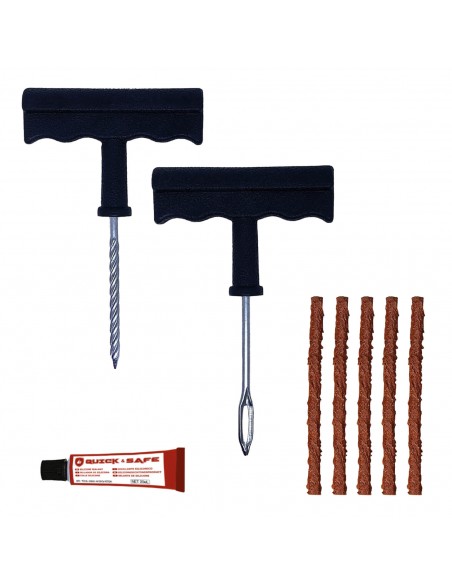 - Este kit de reparación de pinchazos es el más útil y sencillo del mercado. Un producto compuesto por 5 mechas, 1 herramienta en T en espiral, 1 herramienta en T de inserción y cola sellante.