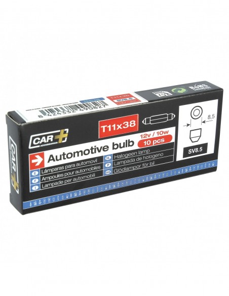 Lampara de 38 mm de largo SV8,5 de 12 Voltios y 5 watts Recuerde comprobar las medidas de la lámpara, ya que por especificaciones técnicas puede ser adecuada pero no ser el tamaño correcto para su vehículo Luz clara ideal para recambioluz de matricula, maletero, luces de posición o luz interior, Cumplen con la directiva RoHS 2011/65/EU de restricción de sustancias peligrosas en aparatos eléctricos. Car+ ofrece un servicio completo de accesorios para mejorar la calidad de tu tiempo dentro de tu vehículo.