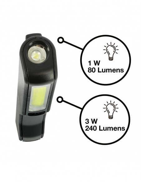 2 potentes modos, LED frontal e 1W que proporciona 80 lúmenes y una tira LED COB de 3W con un potencia de 240 Lúmenes. El rendimiento lumínico es de hasta 120 lúmenes por vatio, el doble que las bombillas. El clip con imán dispone de una rotación de 120º para poder enfocar la tira LED COB con más precisión. El imán permite adheridlo a cualquier superficie metálica y liberar las manos para poder trabajar cómodamente. La duración de la bombilla LED COB es mayor gracias a que genera menos calor y no lleva circuito eléctrico. También tiene una mejor gestión de las fluctuaciones eléctricas. Funciona con 3 pilas tipo AAA, no incluidas. Luz compacta y potente que te servirá para múltiples situaciones ya sea en el trabajo, en el taller en casa o en el coche. No ocupa lugar y se puede almacenar cómodamente en cualquier lugar. Pack Display de 18 und. 9 en Rojo y 9 Negro. Car+ ofrece un servicio completo de accesorios para mejorar la calidad de tu tiempo dentro de tu vehículo.