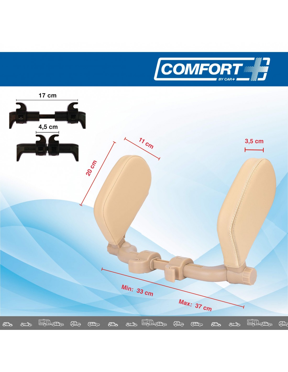 Experimente otra forma de descansar en el vehículo gracias a la gama Comfort+ y su reposa cabezas doble lateral de última generación. Que te permitirá descansar en los largos viajes para disfrutar de lo que importa. El núcleo de espuma visco elástica con memoria de forma confiere múltiples ventajas como un apoyo excelente, confort óptimo y resistencia a la deformación. El reposa cabezas doble lateral Comfort+ recuperara su forma después de su uso y no se deformará, para seguir aportando sus cualidades ergonómicas día a día. Diseño clave para integración con el asiento del vehículo adaptable a la mayoría de reposa cabezas con 2 barras de unió, no valido para asientos deportivo. De montaje sencillo y muy efectivo. Compuesto 2 palas articuladas 180 gra2 de 20cm x 11cm para poder adaptarse a ti incluso cuando lo quieres recogido. En cuero negro, fácil de limpiar y resistente a los olores. La gama Comfort+ tiene como meta ofrecer productos que nos aporten salud y comodidad en nuestro día a día.